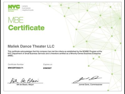 This certificate acknowledges that the Maliek Dance Theater has met the criteria as established by the M/BE Program at the NYC Department of Small Business Services and is therefore certified as a Minority-Owned Business Enterprise (MBE).